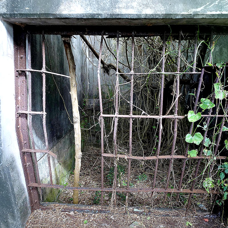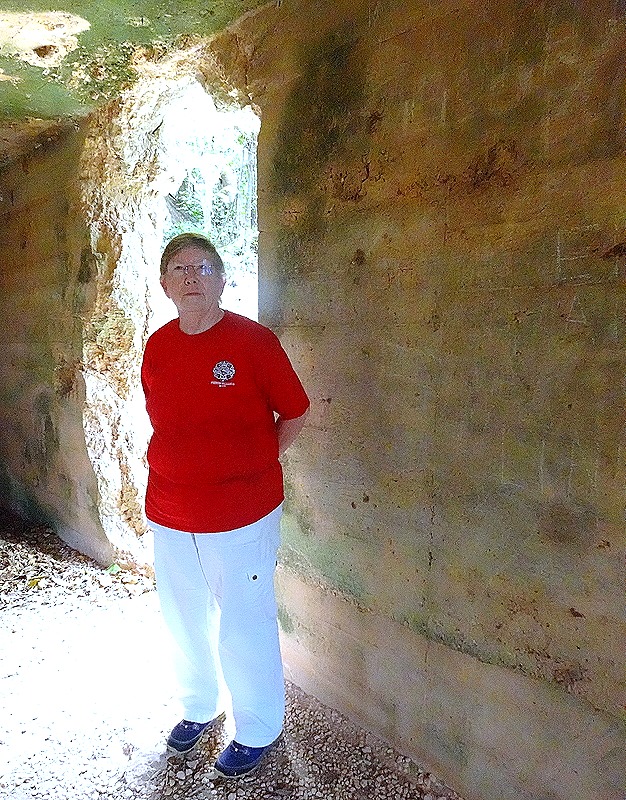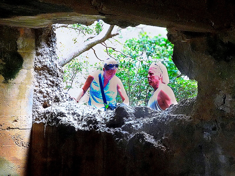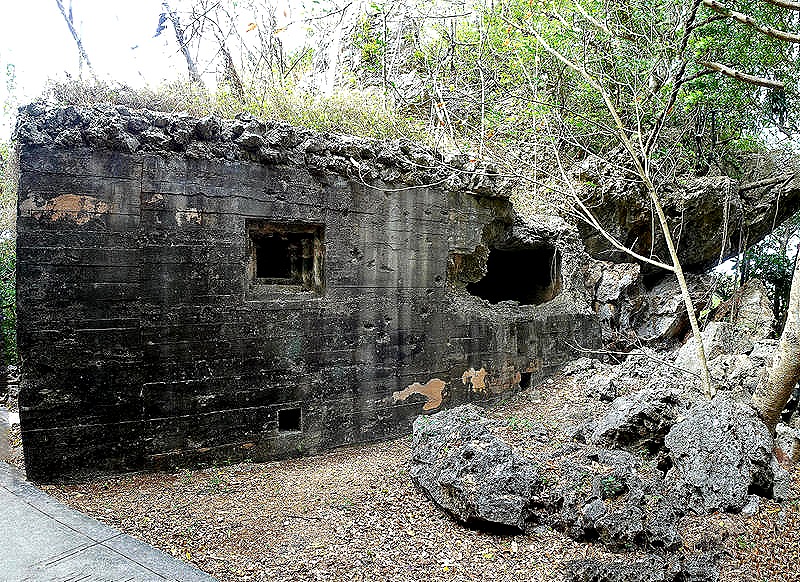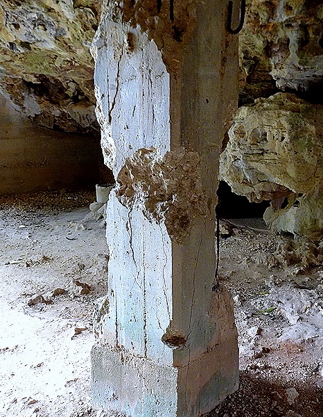 You can see in the picture above that there is one finished opening that is a window and one jagged opening that could have been a window but is also an explosive opening. We don’t know how many of each there are, but we were told about one incident that created two holes in the wall when a shell from a US Navy ship made one hole penetrating into the cave, then took a chunk out of a concrete pillar, then made a hole on the other side as it exited the cave, all without exploding. Hard to imagine & it must have been quite a shocking experience for the soldiers inside. We think we remember correctly which hole was which, but be a little skeptical in viewing the labelling of the following pictures.