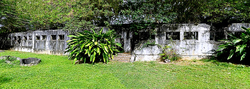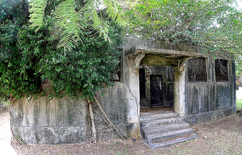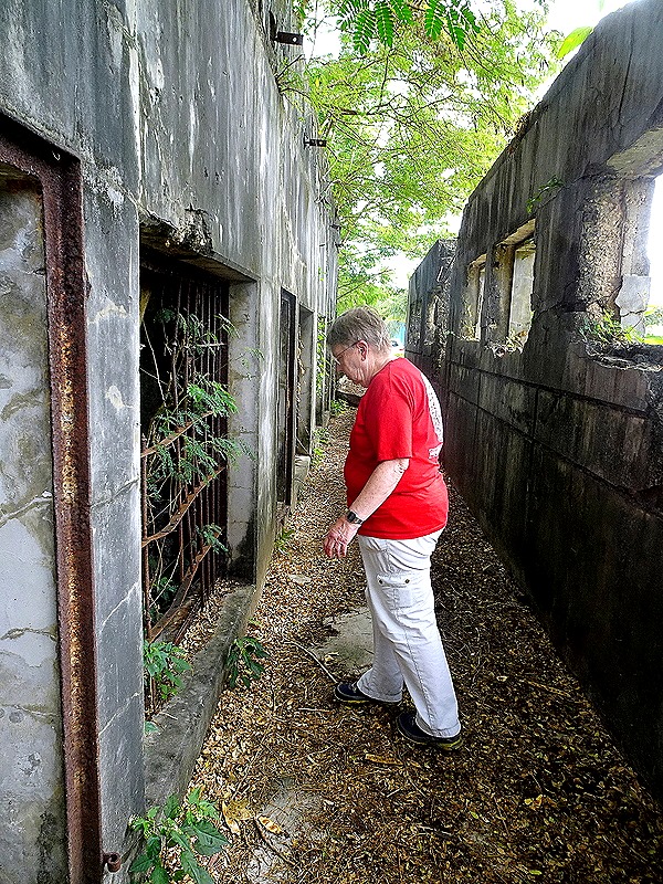 Our last visit before returning to the ship was to the old Japanese Jail in Garapan. You will recall that the Japanese were awarded control of Saipan in the treaty ending World War I and governed the island until losing the battle of Saipan in July, 1944. This jail was built in 1929 and was probably used by the police in the usual manner and also occasionally for a few war related prisoners, often for a transitory period. Today it is a ruins, but interesting to visit. There are three buildings: a large cell block (reportedly for men), a short cell block (reportedly for women) and what is probably an administrative building (no bars on the windows). You can walk through the hallway outside the long cell block, which no longer has a roof.