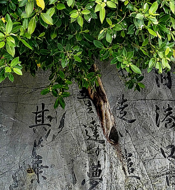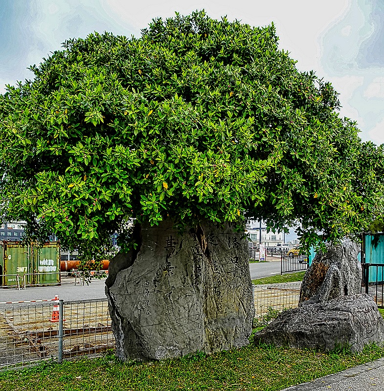 We had a private excursion scheduled for our second day in Naha so we decided to spend our first day visiting the main shopping area of the town, which was within reasonable walking distance from the port. As we left the port we passed what looked at first like a tree, but closer inspection revealed that it was actually a bush growing out of an inscribed rock.