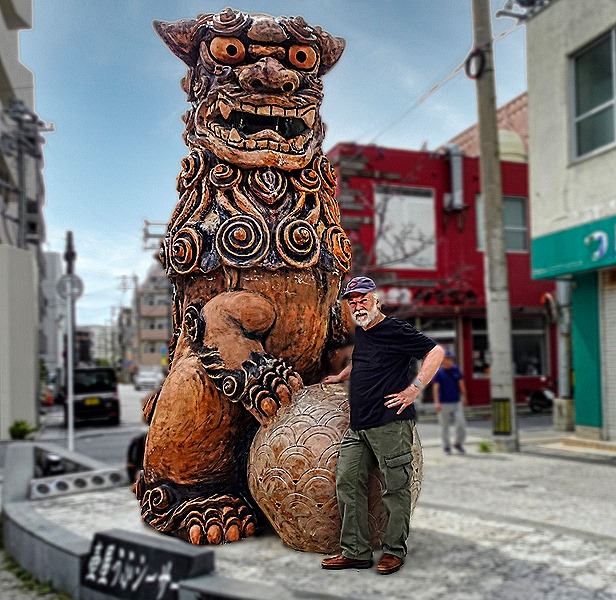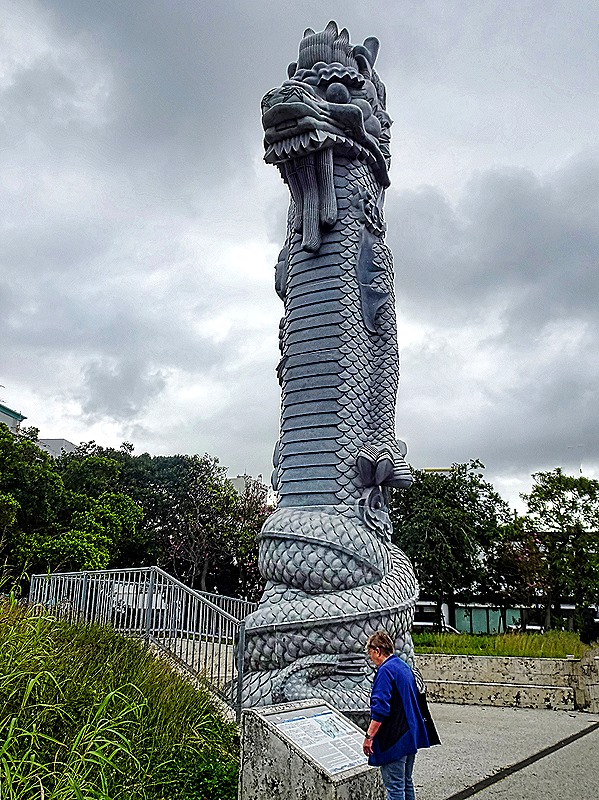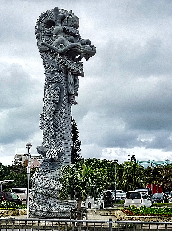 Turning up another street heading away from the water we came to two dragon pillars, erected in 2015 to commemorate the 30th anniversary of Naha’s friendship agreement with Fuzhou City, China, which was celebrated in 2011. Each dragon is 15 meters high and 3 meters wide. They were modeled on dragon sculptures that were in the main hall of Shuri-jo Castle, the home of the Ryuku monarchy, which were lost in a 2019 fire that destroyed the castle.