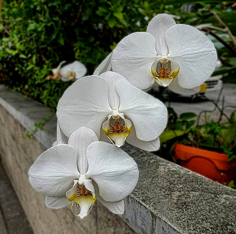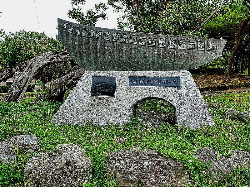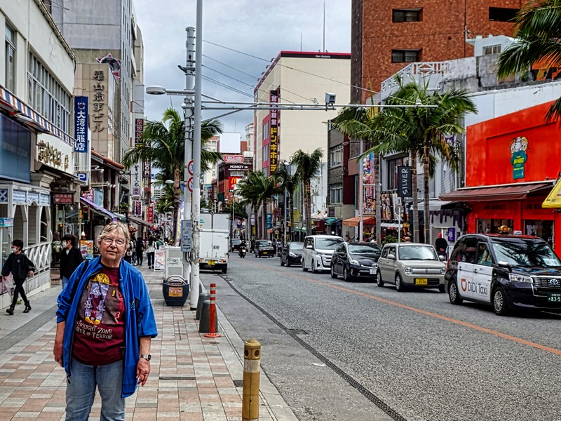 Further up the street we happened upon a low building housing public restroom facilities. After availing ourselves of the facilities we continued on toward our goal, the main shopping street. We passed what we learned later was Matsuyama Park, much larger than what we could see from the sidewalk. It had nice flowers and a monument shaped like a boat dedicated to Kume Village, a settlement established here more than 600 years ago by a group of 36 families who travelled by sea from Fujian, China, and greatly influenced the political, cultural and economic development of Okinawa.