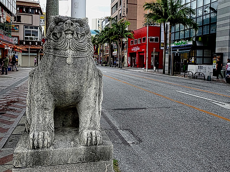 We crossed a river lined with pillars holding up the monorail track and reached our goal, called Kokusai-dori (International Street).  As we turned left onto this street we were met by a sculpture of a shisa (lion/dog).