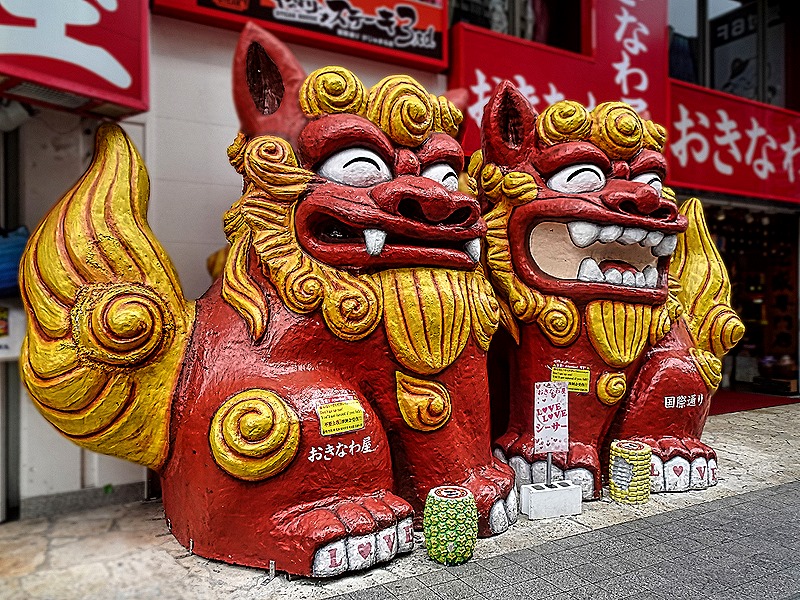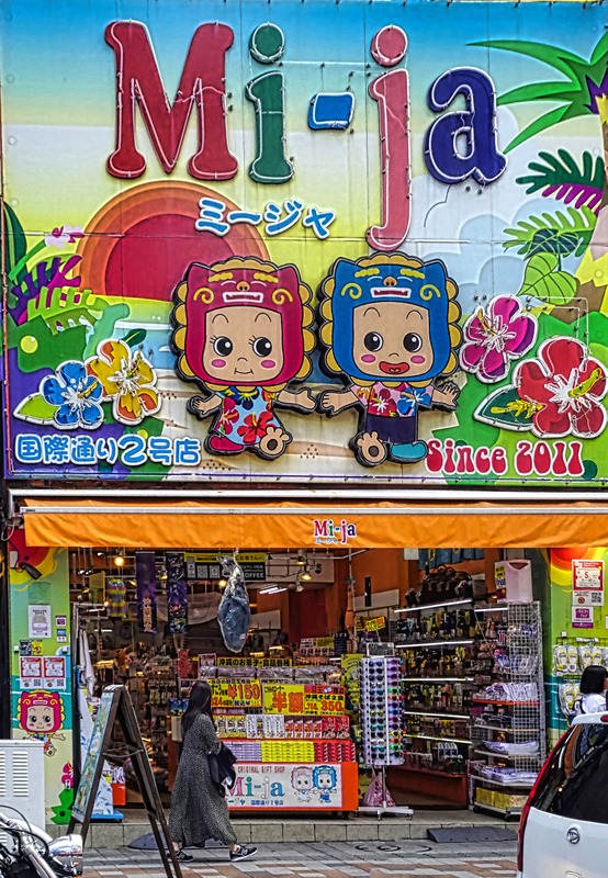 As we mentioned in the Ishigaki episode, shisa are a combination lion and dog and they generally come in pairs. The female that is usually on the right has a closed mouth to retain good spirits, while the male that usually sits on her left has an open mouth to scare away evil spirits. They are thought to have been first brought here from China in the 14th century as gifts for Ryukyu royalty and today you can see them everywhere, placed on roofs and in front of houses and other buildings to protect the premises. Many of the shisa in the museum are single sculptures, perhaps because their pairs have been lost. The shops on Kokusai street are full of colorful shisa, mostly small and looking mass produced for the tourist trade, although some are much nicer than that. We really liked the more artistic shisa, which are all similar in design but each one distinct, and you will see a lot of them here (and tomorrow) since they are such an important part of this island.