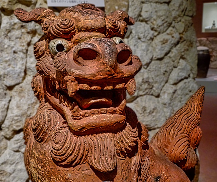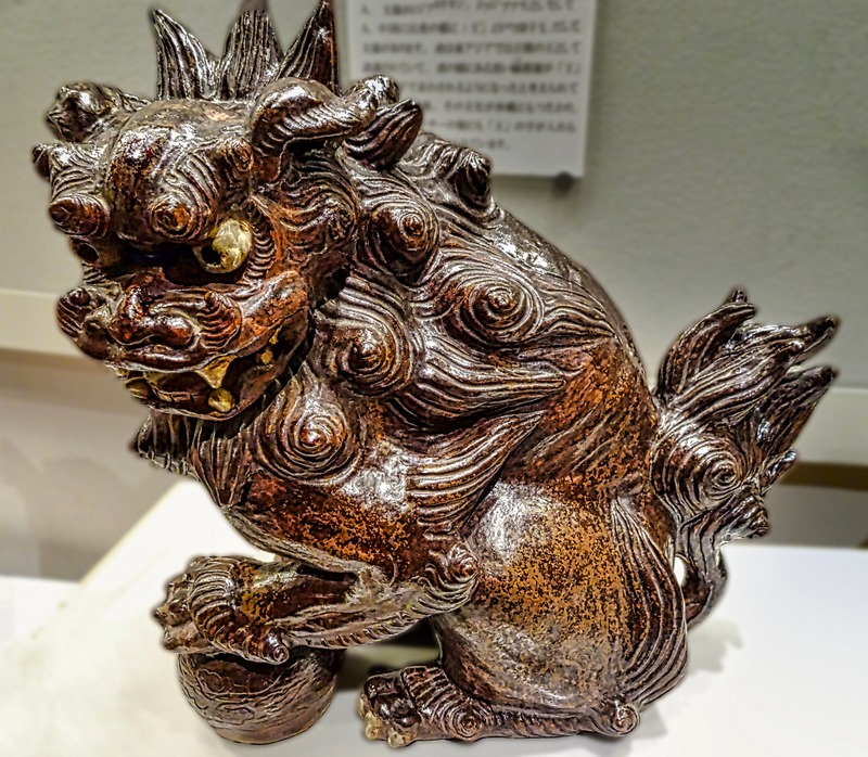 It took a while to find in the maze of often unmarked streets behind the markets, but we finally came to the Tsuboya Pottery Museum. It sits in the Tsuboya neighborhood, which has been the center of Okinawa pottery making for centuries and still has a good number of pottery shops and workshops. The museum is quite interesting (although most of the signage is only in Japanese), with exhibits old and recent plus an interesting video showing how the distinctive Okinawan red tile roofs are made. A number of ceramic sculptures were on display, including several shisa.