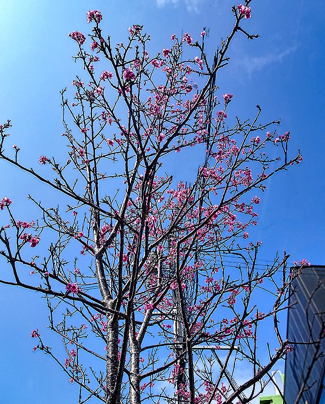 After exploring some of the very interesting shops near the museum we headed back to Kokusai Street and the ship.  Along the way, we noticed some colorful flora, one of which was a young tree covered with pink buds.  Our first reaction was that this must be one of Japan’s famous cherry trees, but we found out later that cherry season had ended in Okinawa about 10 days earlier.  So more likely these were plum or peach buds (or maybe we were just lucky).  We also encountered more shisa, large and small, on the street level and also on roofs.  The facade of one building closer to the port sported an interesting relief.