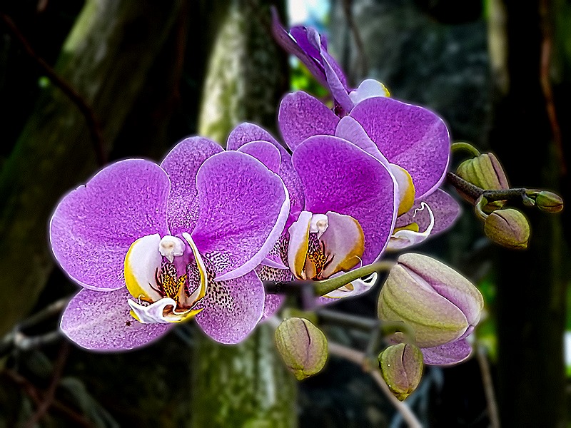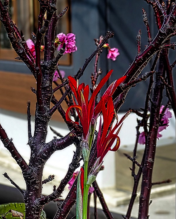 After exploring some of the very interesting shops near the museum we headed back to Kokusai Street and the ship. Along the way, we noticed some colorful flora, one of which was a young tree covered with pink buds. Our first reaction was that this must be one of Japan’s famous cherry trees, but we found out later that cherry season had ended in Okinawa about 10 days earlier. So more likely these were plum or peach buds (or maybe we were just lucky). We also encountered more shisa, large and small, on the street level and also on roofs. The facade of one building closer to the port sported an interesting relief.