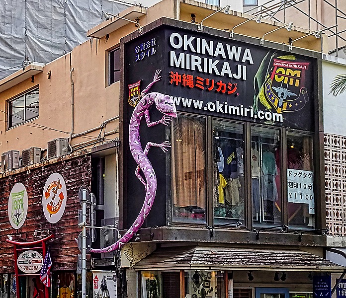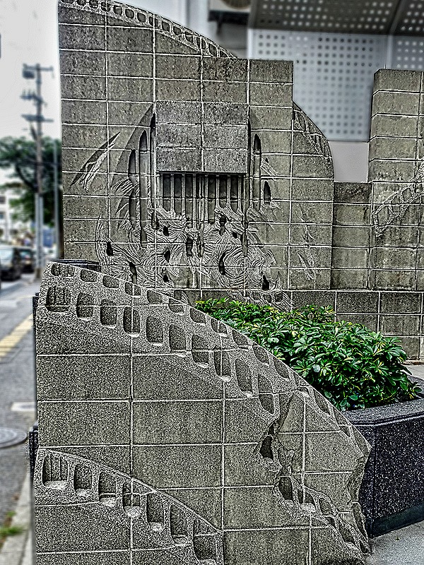Turning up another street heading away from the water we came to two dragon pillars, erected in 2015 to commemorate the 30th anniversary of Naha’s friendship agreement with Fuzhou City, China, which was celebrated in 2011.  Each dragon is 15 meters high and 3 meters wide.  They were modeled on dragon sculptures that were in the main hall of Shuri-jo Castle, the home of the Ryuku monarchy, which were lost in a 2019 fire that destroyed the castle.