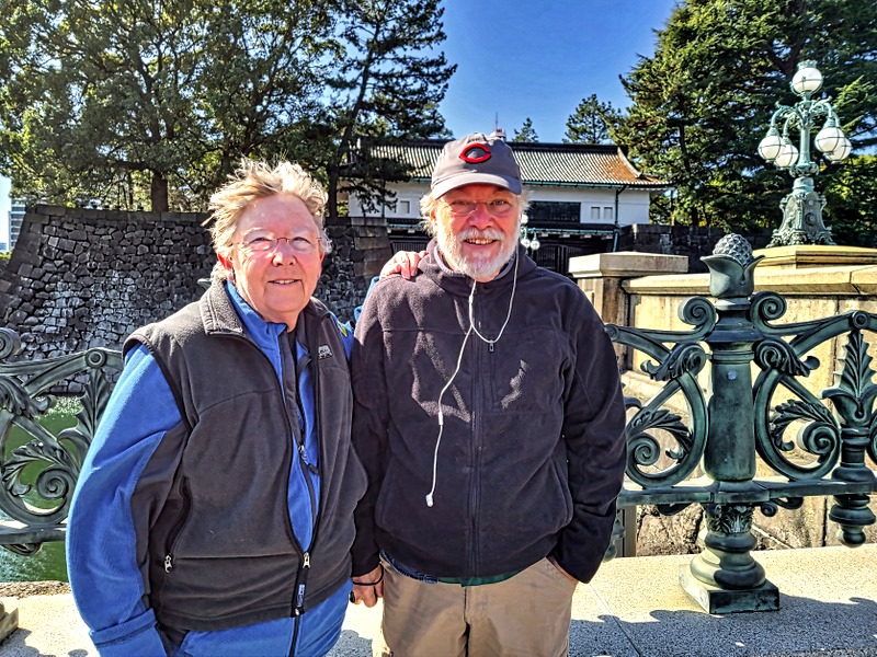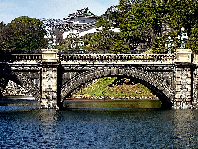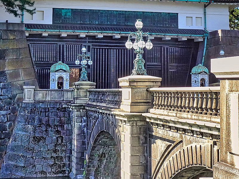 The outside spaces inside the palace grounds are open to the public for a few hours twice a year, on January 2 and the Emperor’s birthday. At other times members of the public without a reservation for a private tour (still only outside) can enter some of the peripheral gardens and also the plaza leading to the Main Gate. The latter spot is where we arrived after our walk. We walked up along a moat with heavy stone castle walls and where the moat turned left we could see the Nijubashi Bridge and an Edo era building beyond (which survived the war) called the Fashimi-yaguri Watchtower. There are actually two parallel bridges across the moat, each with unusual lamps on top of its uprights. The stone bridge in front is called the Meganebashi (Eyeglass) Bridge (because the double arches look like round glasses when reflected in the water) and the metal bridge behind it is called Nijubashi (double) Bridge. This name comes from the original two level wooden bridge built here during the Edo period which was replaced by the current steel bridge in 1964. We were able to walk up a ramp on top of the wall on the right as far as the entrance to the stone bridge.