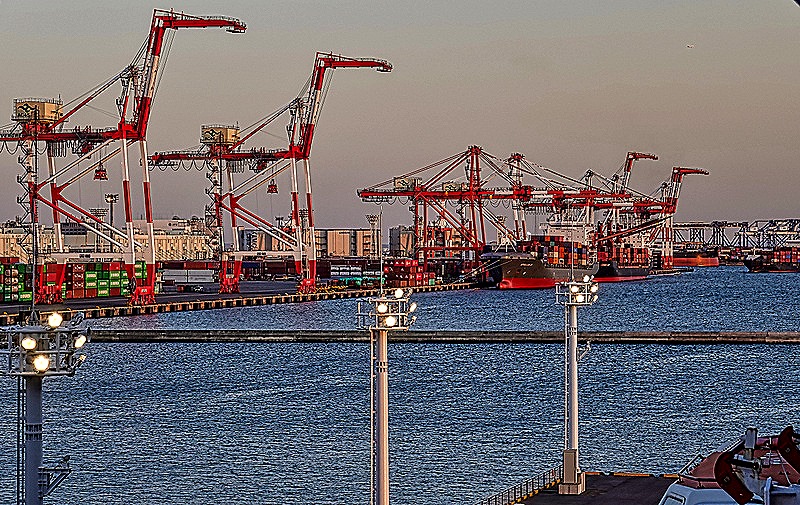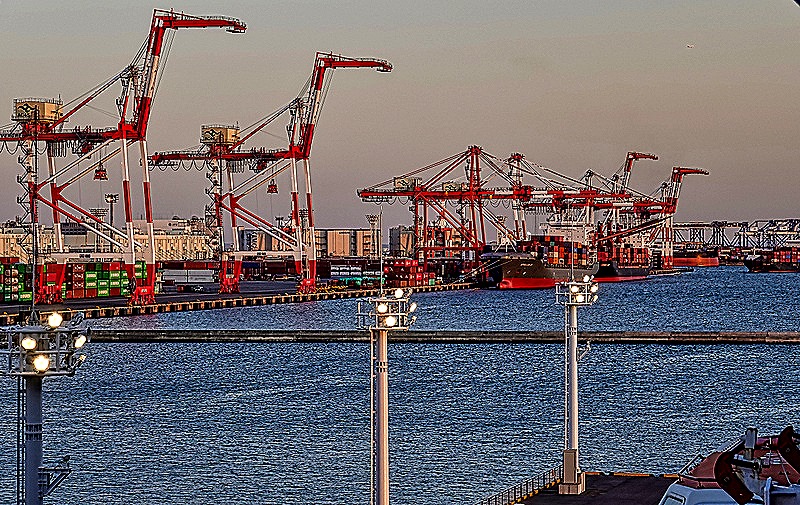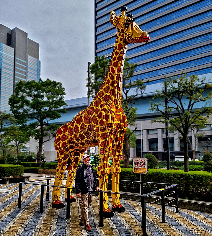 On the sidewalk in the street below we encountered a life size Lego giraffe. There is a Legoland in the Decks mall, but this was in a different location. After this it was time to go home, so we walked back to the Hilton and boarded another shuttle. We passed the Rainbow Bridge (which looks great from any angle) and, back on the ship, we had a view from our balcony of the cranes lining one side of the port looking nice in the late afternoon sun.