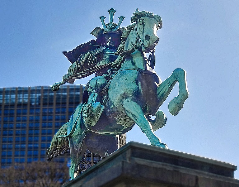 On the way we drove past the building Douglas MacArthur used as his headquarters as commander of the occupation after the war. It was built in 1933 and survived the war. We had a fairly long walk through the many carefully landscaped pine trees in Kokyo Gaien National Garden to the viewing area near the palace. We stopped to look at the bronze equestrian statue of Kusunoki Masashige, a 14th century samarai considered the ideal embodiment of loyalty, courage, and devotion to the Emperor. This statue was erected in 1900.
