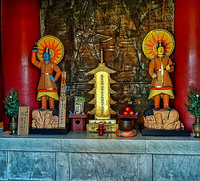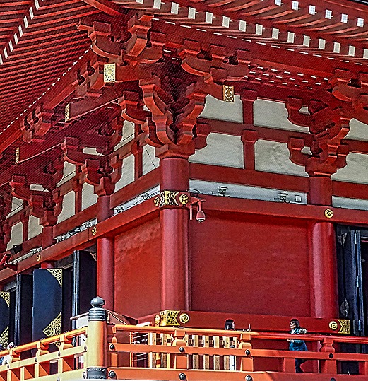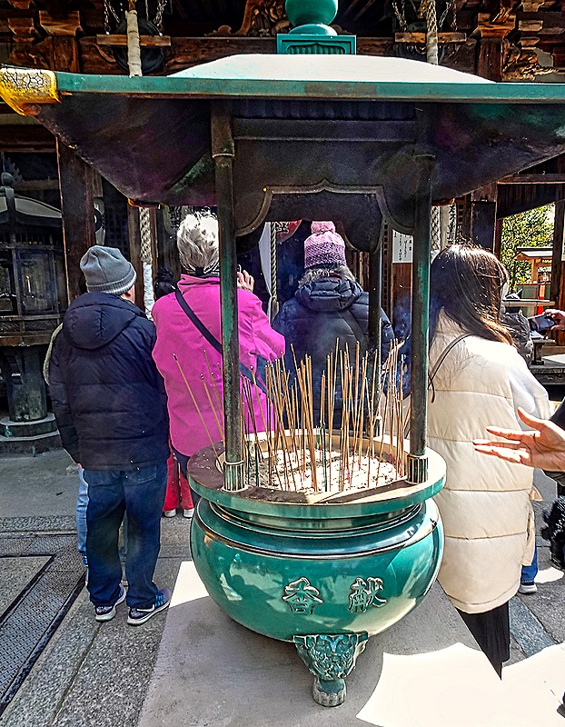 We walked through the very crowded interior of the main hall. Inside were a number of paintings and in the center a shrine-like area behind a metal screen containing many objects that must have important religious significance. It is said that the original tiny (less than 3” tall) statue of Kannon that led to the founding of the temple is still there, housed in an elaborately decorated three layer box, but no one has seen it since 645 when it was first decided that it was too sacred to be seen. We did not see this box and are not sure which building it might be in. We exited the packed hall on the other side, relieved to leave that crowd behind.