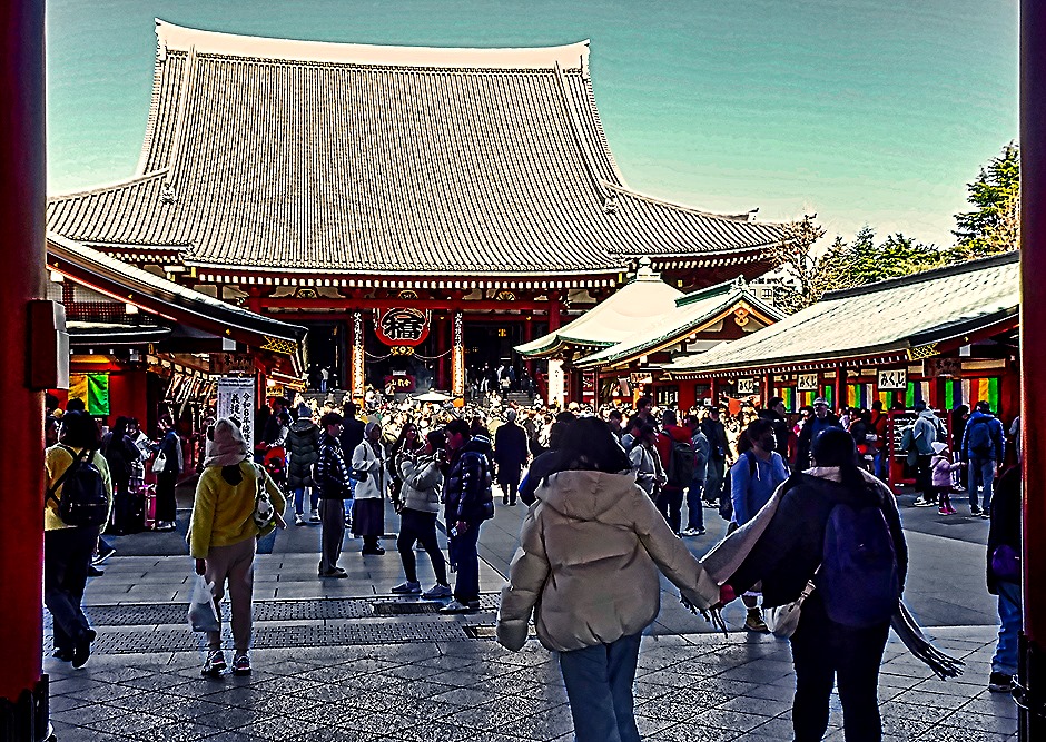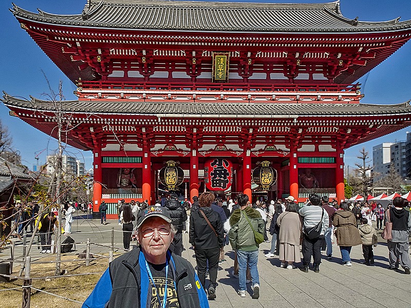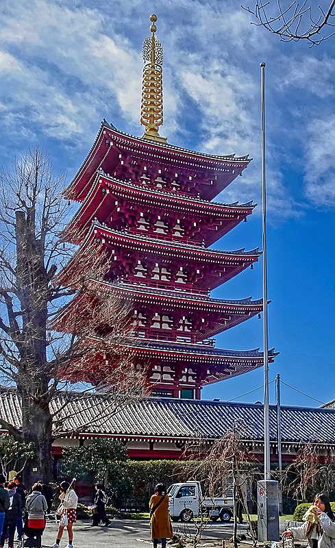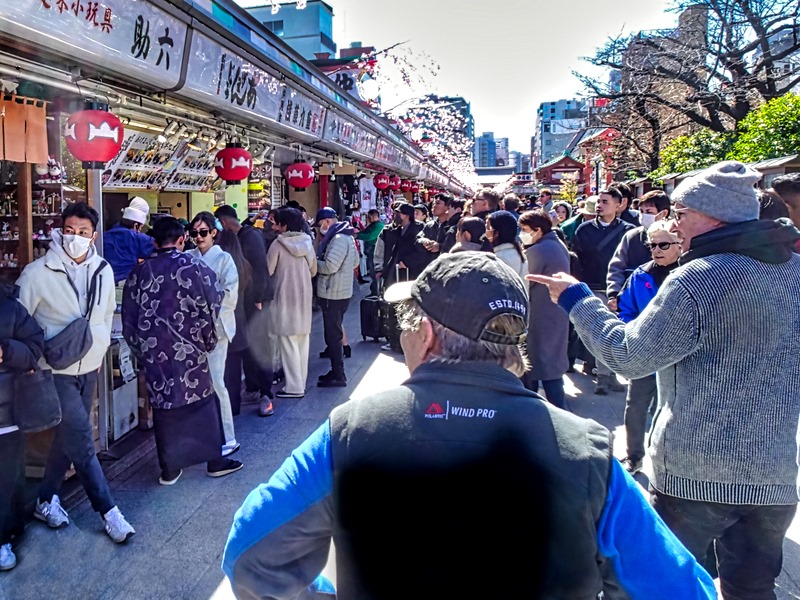 We went out through the Hōzōmon Gate to walk down Nakamise Dori, a long crowded pedestrian shopping street lined on both sides with vendors’ kiosks. It is within the temple complex, inside the largest gate. Vendors have been selling many different wares here for centuries. Above some of the shops were branches with pink blossoms (probably too early for cherries in Tokyo). Among the crowds were a number of women dressed in kimonos. We wondered who they were, but it turned out they were visitors like us (the ones pictured are from Korea). There is a popular tradition here of renting (by the hour) period costumes to feel more a participant in the activities. We saw this at a number of places throughout Japan and China, not just here.