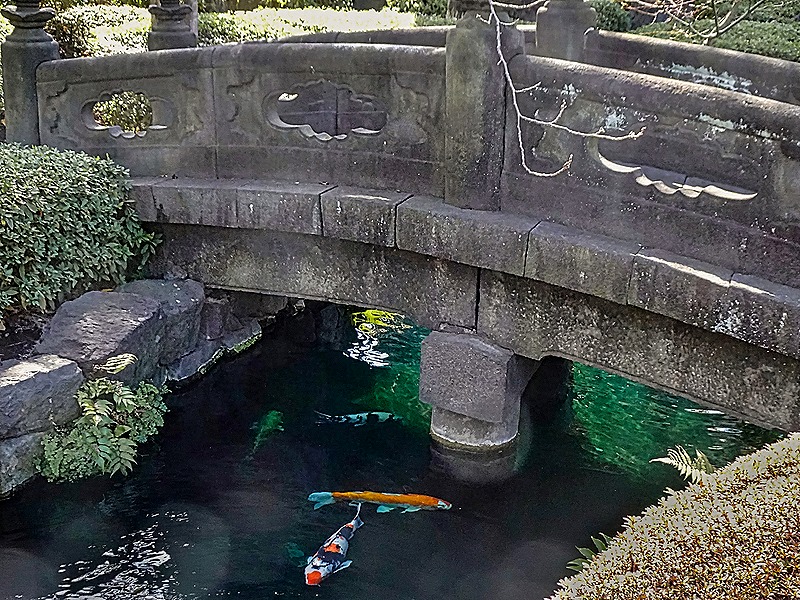 Beyond the main hall on this side was a garden area, with sculptures and a stone bridge over a koi pond. Very pleasant and picturesque.