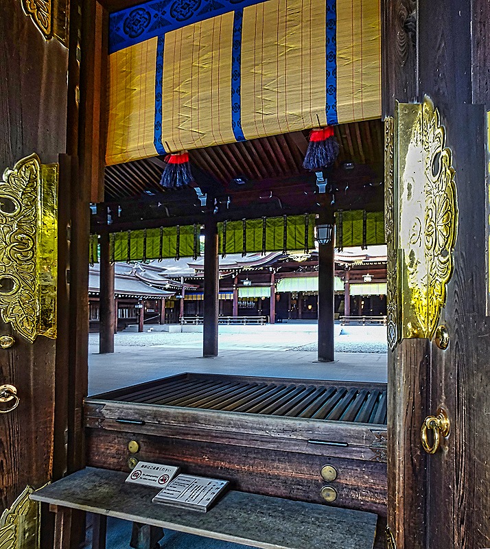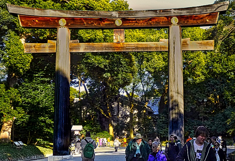 Torii gates are ubiquitous throughout Japan. There are some 90,000 Shinto shrines in the country and each one has at least one Torii gate. They are erected to mark the boundary between the sacred ground of the shrine and the profane ground outside. They are generally very graceful and simple in design, mostly just two pillars connected by one or two cross beams, sometimes with a small sign in the center between the beams. The Meiji Shrine has Torii gates in the woods at each entrance and also nearer the shrine itself. We walked through several large wooden ones to reach the shrine and there was another inside the outer gate of the shrine.