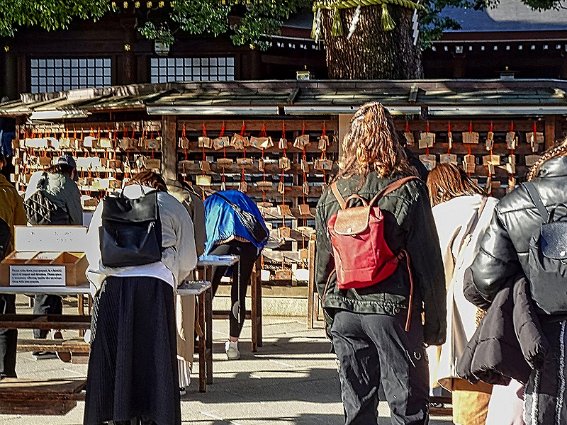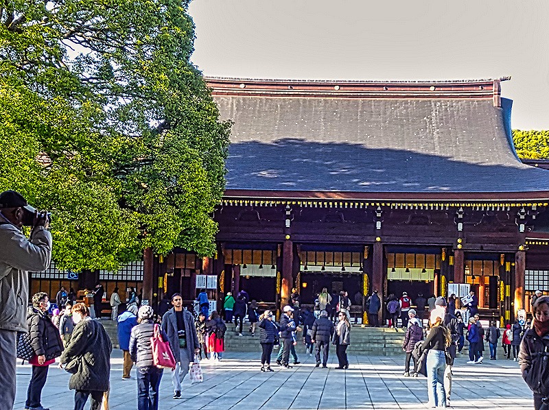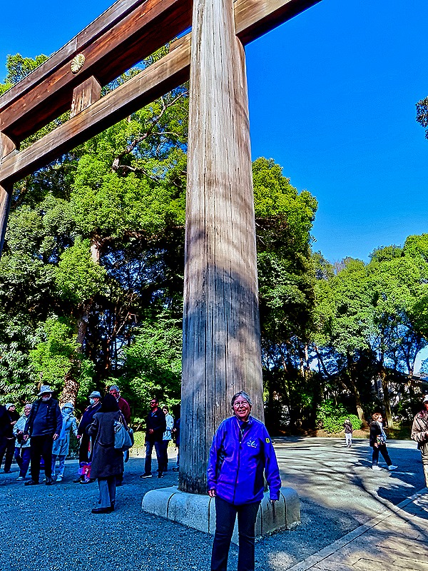 The Meiji Restoration in the 1860’s removed the Shogun and returned effective rule to the Emperor. The Meiji emperor (whose birth name was Matsuhito) ended the Shogunate’s isolationist policies and led Japan through an era of rapid modernization until his death in 1912. Meiji-jingu, a government sponsored Shinto shrine honoring the Meiji Emperor and Empress Shoken, opened to the public in 1926. (Note: our guide helpfully explained that in Japan temples are Buddhist and shrines are Shinto.) It does not contain their graves, which are in Kyoto. The shrine was destroyed in the 1945 bombings and the current reconstruction opened in 1958. We have read that this shrine receives 30 million visitors each year.