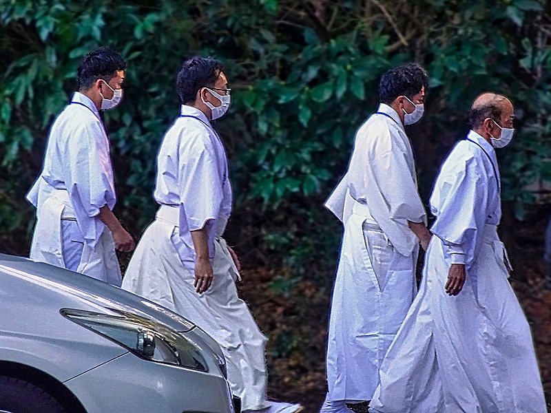 I walked up the steps of the inner shrine and, although entrance was not permitted, took a couple of pictures through a window of the courtyard within. Well it turned out that photography through the window wasn’t allowed either . . . who knew? To be fair there was a sign nearby that I hadn’t noticed. An attendant ran up and pointed the sign out, so I stopped and rather sheepishly walked away. After Sue was taken away we left the compound through the gate where we had entered it and returned to the bus. In the parking lot we saw what looked like a line of monks or priests all dressed in white heading toward the shrine.