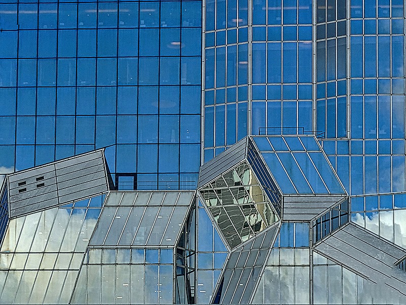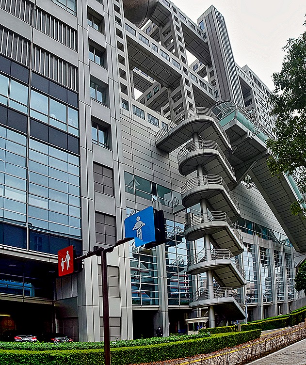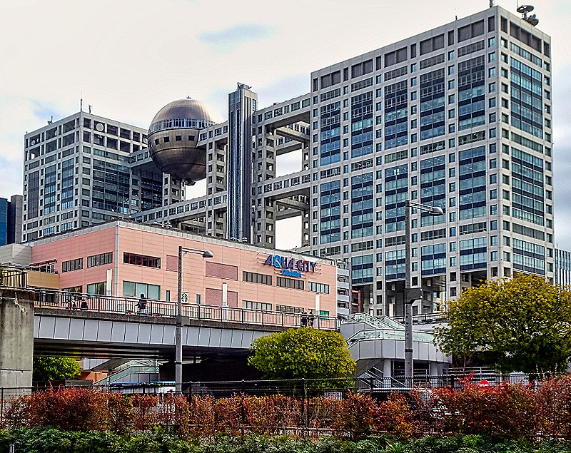 We left the waterfront and walked down a street that was a canyon among large buildings. On one side was the 27 story Fuji Broadcasting Center. It has two tall buildings, an office building and a media building, connected by three footbridges longer than either building. At the top just off center is a huge metal sphere containing an observation deck. The entire building is covered in titanium & was opened in 1996. At street level is a large transparent tube containing an escalator that goes up several stories. Nearby is the pink Aqua City, yet another shopping mall.