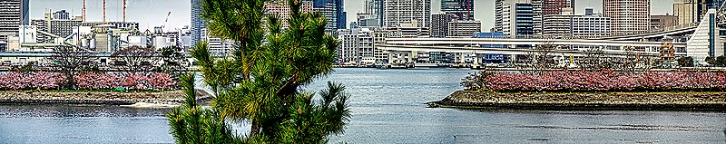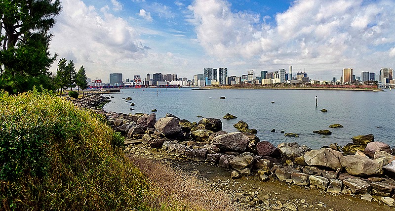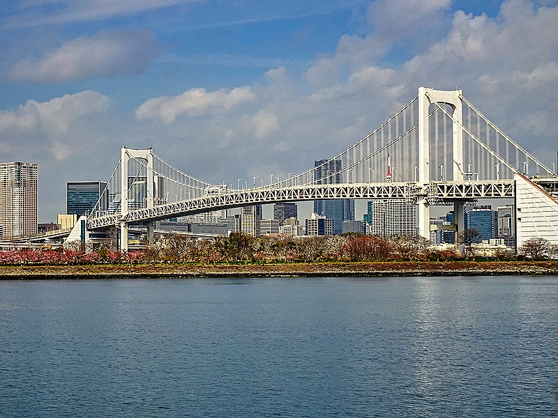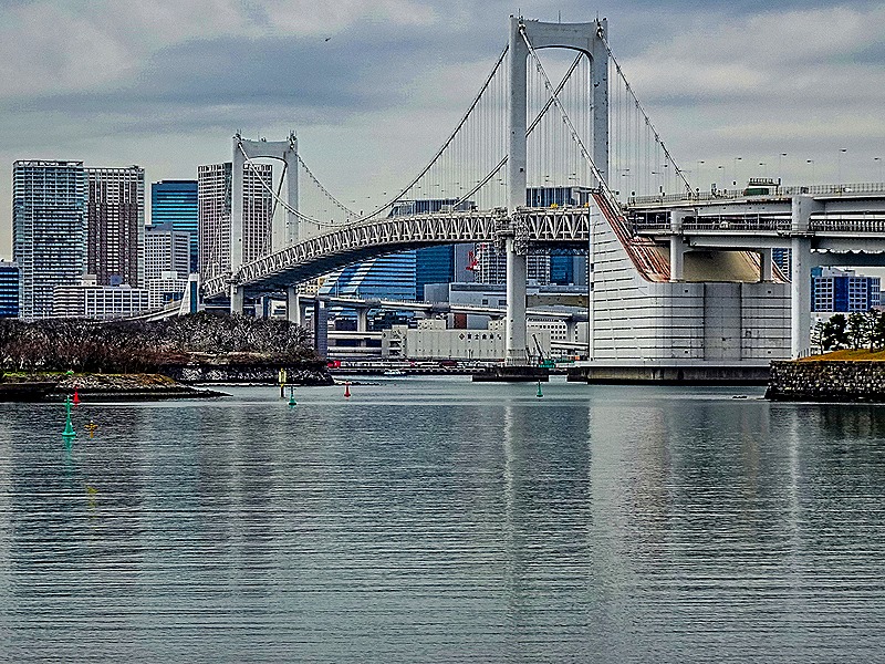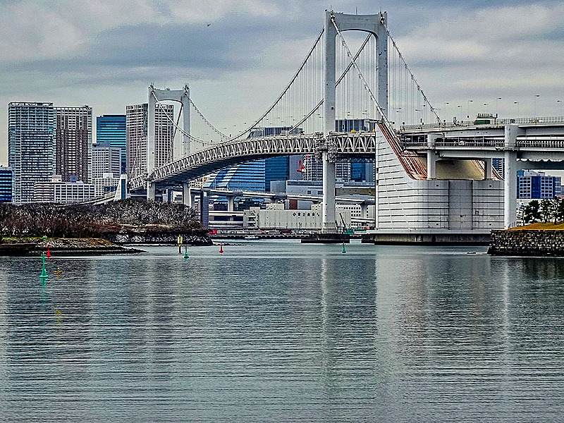 Although it was a bit chilly, this was a beautiful morning for a walk. A shuttle bus was available going around much of the island and, after a leisurely breakfast and the departure of most tours, we boarded the bus and rode it to the Hilton Hotel stop near the waterfront leading to the Rainbow Bridge (which opened in 1993). We walked along one of the boardwalks paralleling the water. Quite a view of Tokyo and the bridge from here.