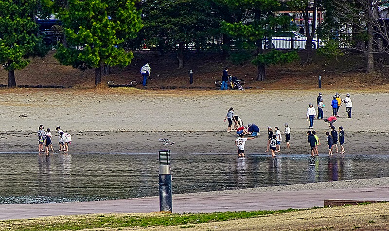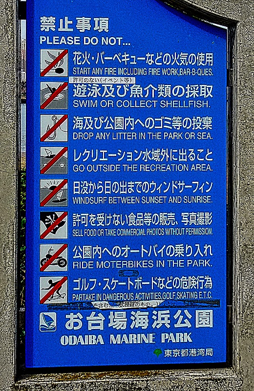 Further down the waterfront walk we came to a beach with some young people wading in the shallows. We have read that this is one of only two beaches in Tokyo not obstructed by industrial buildings, but actual swimming is not allowed. This is also a convenient place to mention vending machines, which are everywhere in Japan. You can buy a large variety of food and drink from them, cold or hot. There was a bank of them here and we also saw an even larger row of them at the Meiji Shrine in Tokyo yesterday. Near the beach a sign was posted with a long list of “do nots” . . . it made us think of Singapore.