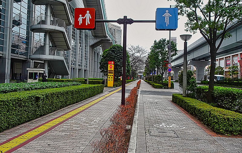 The sidewalk next to the Fuji building included an interesting safety feature. On the left is a lane for walkers and on the right is a lane for bikers, separated by a median strip planted with red flowering bushes. We were told that the narrow yellow path on the left helps blind people with canes negotiate the sidewalk better because it is paved with different shaped stones. This reminded us a little of the separate lanes for bikes and pedestrians in Amsterdam, and we saw sidewalks laid out like this in other areas of Japan as well.