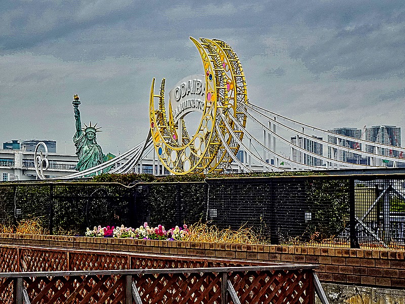 Odaiba is an artificial island in Tokyo bay, connected to the main city by the Rainbow Bridge. Its origins date back to the 1850’s after Commodore Perry’s first visit. “Daiba” means fort or battery, and the plan was to build 11 small island batteries in the bay to protect against attacks from the sea. Only 6 were finished before the project was abandoned and by the 1960’s most of the small islands had been removed and we have read that landfill was used to connect the rest to make the larger island of Odaiba. After on and off development efforts in the 1980’s and 90’s, full development of the island has occurred rapidly since the second half of the 1990’s and the island is now crowded with hotels, commercial buildings, shopping malls, museums, restaurants and entertainment venues, many with very futuristic architecture.
