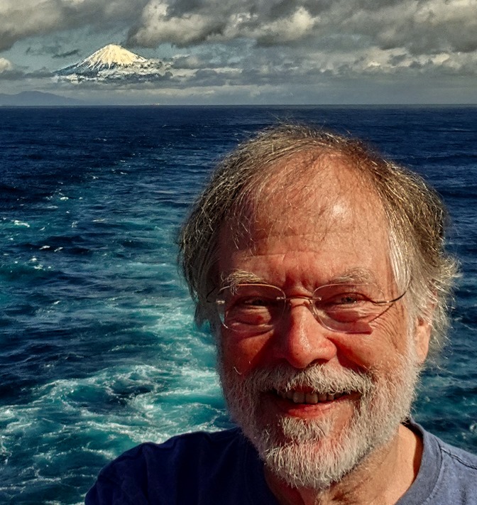 After the Captain’s announcement Rick, along with a crowd of other passengers, hurried up to the deck by the aft pool and, sure enough, there it was emerging from the clouds far in the distance. It took a while to get to the front of the crowd, but the mountain was still quite visible and, like everyone else, Rick got a picture of himself with the mountain (not a selfie, Robert took it).