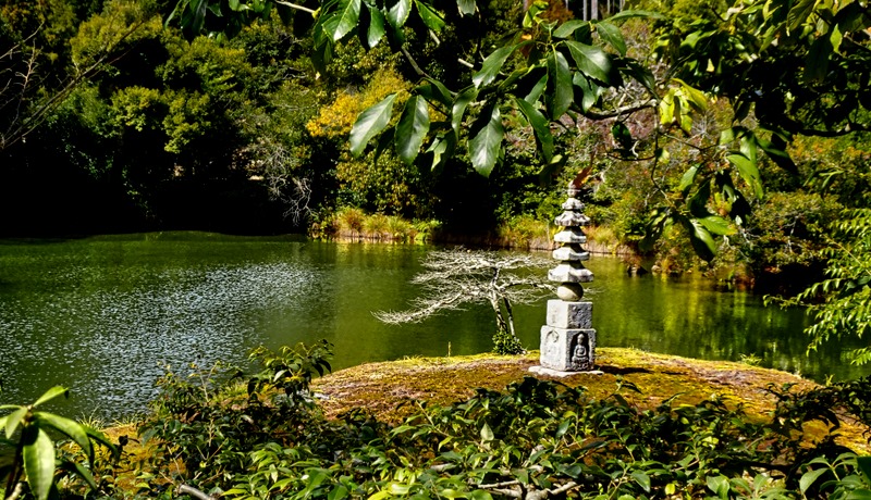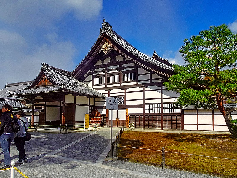 Another interesting building on the grounds was the Abbot’s House (where the temple’s abbots resided). In front of it is a 600+ year old pine tree planted by the shogun who built the Golden Pavilion. It was originally a Bonsai and has been trained to resemble a ship. The trunk growing straight up represents the mast and the large branch reaching forward, held up by a bamboo cradle, represents the bow of the ship. Some say it represents the journey the shogun hoped to take to the afterlife.