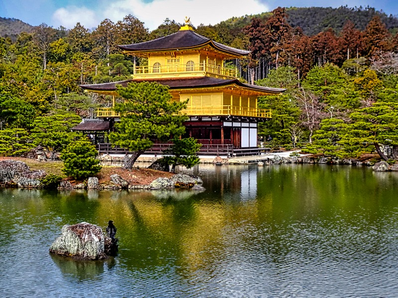After about a 90 minute drive we arrived at our first stop in Kyoto, the Temple of the Golden Pavilion, called Kinkaku-ji in Japanese. Originally a private villa, it was bought by the shogun in 1397 and developed as his retirement villa. Pursuant to his wishes, when he died it was converted into a Zen Buddhist temple. The upper two stories of the three story building are entirely covered in gold leaf and are said to contain relics of the Buddha, including his ashes. Each of the three stories was designed in a different architectural style. Situated over the edge of a large reflecting pond in a woods, the Pavilion makes a rather spectacular sight when the sun is shining, and many consider it one of the most beautiful buildings in the world. After receiving our entry tickets (there was a bit of a crowd) we walked a path through the woods to arrive near the water’s edge on the opposite side of the pond from the Pavilion.