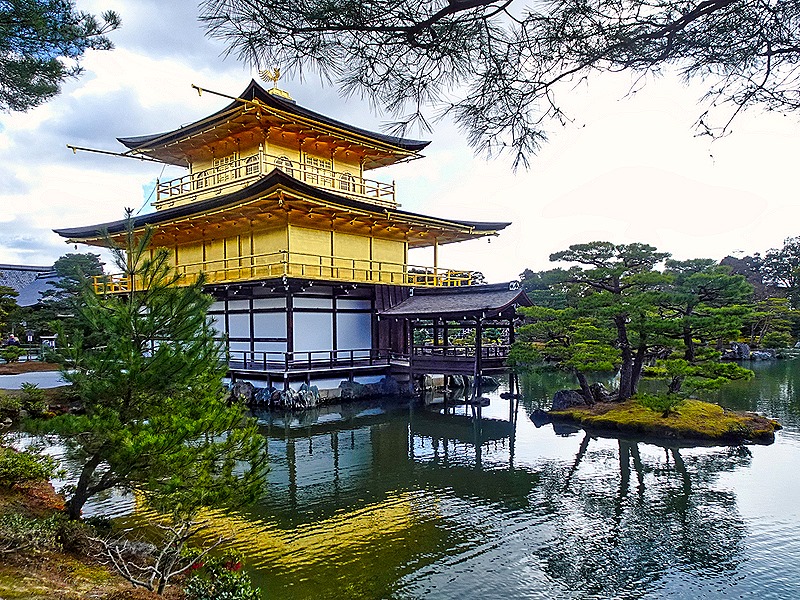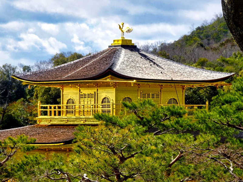 We told you earlier that Kyoto escaped the bombing in World War II so you might think the Golden Pavilion came through the war unscathed. And it did. But on July 2, 1950, the building was completely destroyed by a fire deliberately set by a young monk later found to be mentally ill (he was imprisoned but died six years later of tuberculosis). So despite surviving the war, not to mention the centuries before that, the building we see here is a recent reconstruction completed in 1955. It is supposed to be a very close copy of the original. In the 1980’s the gold leaf was replaced by a much thicker variety after it was found to be peeling off and in 2003 the roof was restored.