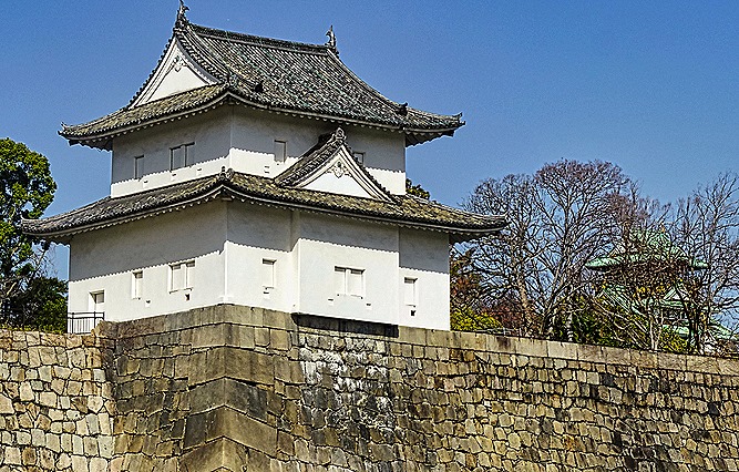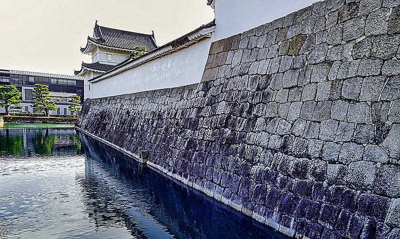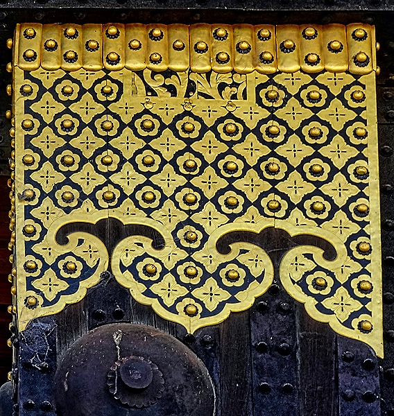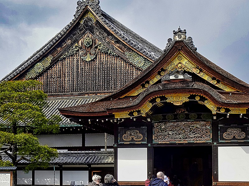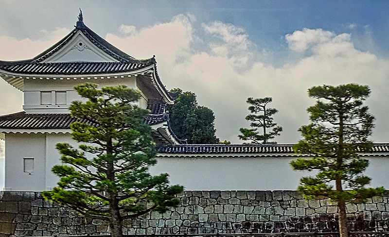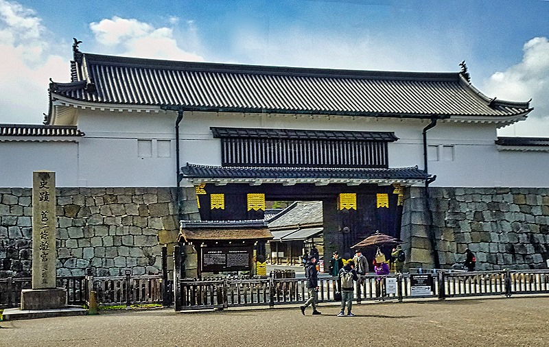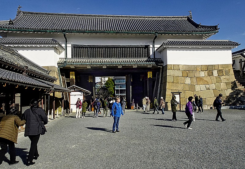 Nijo-jo is a castle in Kyoto built by the first Tokugawa shogun, which opened in 1603. It was financed by funds he forced all the daimyos (feudal lords) of Western Japan to contribute. It is surrounded by a heavy stone wall and a moat (actually two concentric sets of walls and moats). It is the only fortified castle in Japan from that period that still exists without having been destroyed and reconstructed (its tower was destroyed by lightning in 1750 but was not reconstructed). Of course Kyoto was the imperial seat at that time and the shogun lived in Edo (Tokyo), so the purpose of this castle was to serve as the shogun’s residence when he visited Kyoto (and to remind everyone who was the real power in the empire).