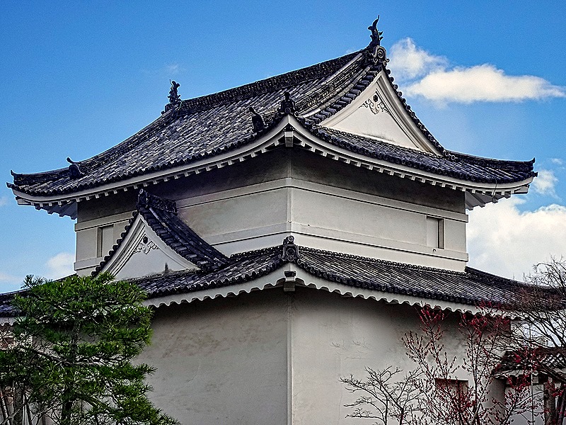 High above the moat beyond the bridges is the old Fashimi-yagura watchtower, built in the old Japanese style common in castles of the era. Quite a sight above the stone bridge in front of it. If you look closely at the second picture below on the right you should see a row of black decorative metalwork running along the top of the stone railing; this was all we could see from our viewing point of the metal bridge behind the stone bridge.