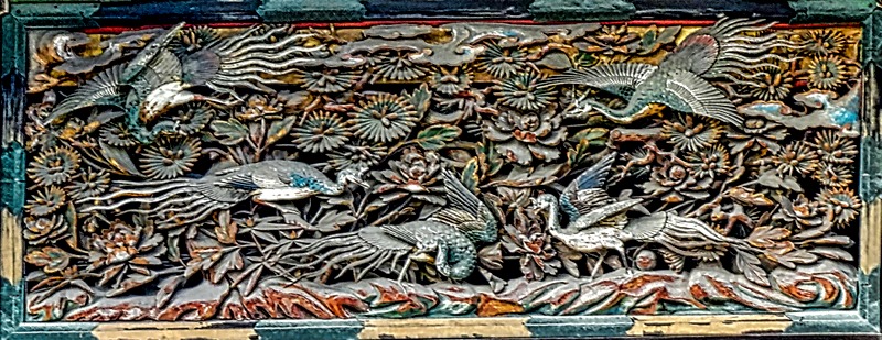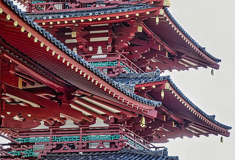 Coming around the back of the temple gave us a much closer view of its structure. Unfortunately, this was as close as we could get because there was no admittance into the building. At the apex of the temple’s roof is a distinctive bronze phoenix, which escaped the fire in 1950 because it had been removed for repairs. A wooden “fishing pier”juts out to the right with a floor high enough for small boats to pass under.