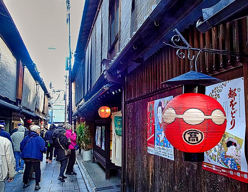 We walked down Shijo Street and turned left into the heart of Gion, with its narrow stone streets lined with vintage wood townhouses, mostly less than 3 stories tall, called Machiya. Urban buildings of this style, generally used by craftsmen and merchants with retail space lining the street and living quarters in back, have been in use in Japan for 1,000 years. They dominated in Kyoto for centuries but in recent decades have been disappearing to make room for modern buildings. They are typically about 20 feet wide along the street and about three times that in length toward the back, often including garden courtyards. We did not enter any of these buildings but walked by many of them lining the street and serving as restaurants, night clubs and shops as well as homes. We understand that each district has its own representative logo and that the red lanterns hanging in front of many of the Machiya here represent the Gion district.
