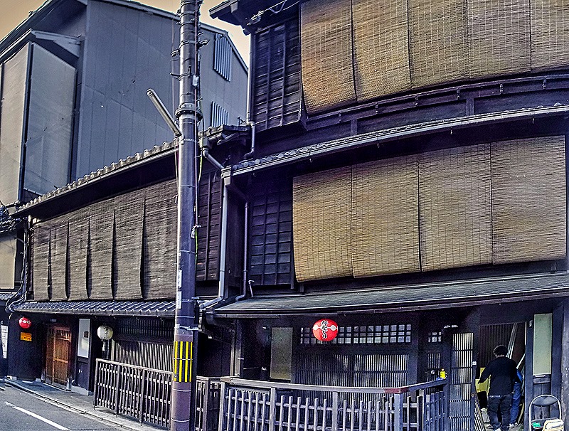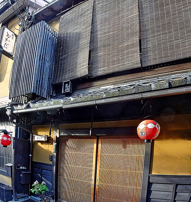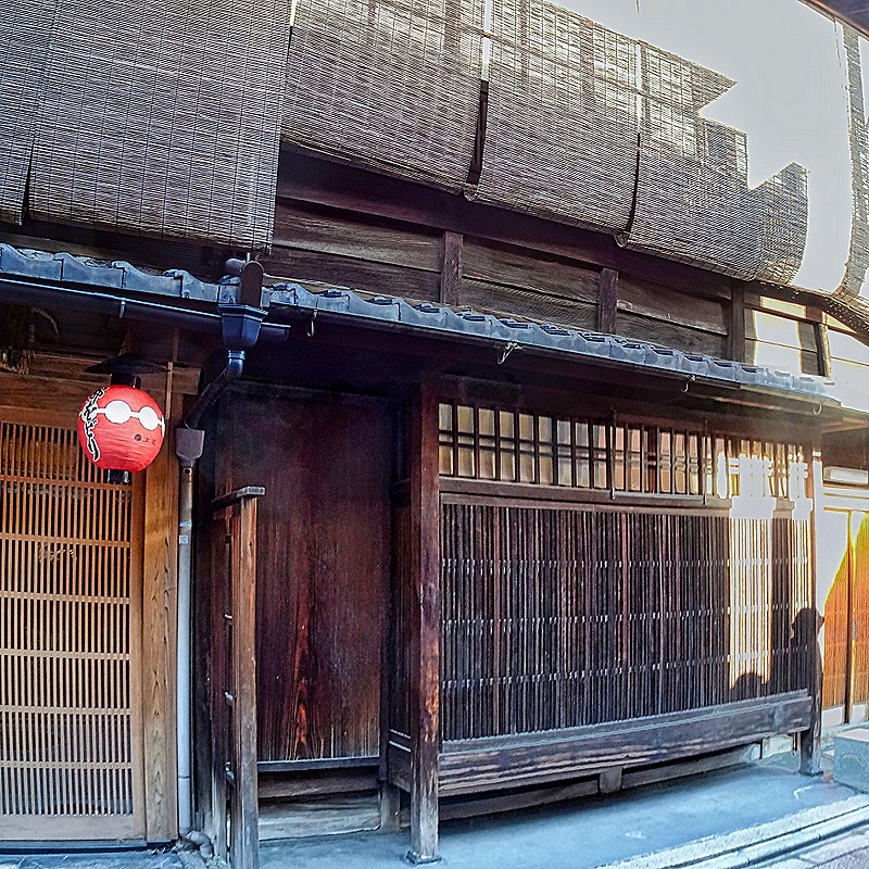 There are several notable features of the Machiya. Particularly on the second floor windows they usually have screens made of horizontal wood slats woven together with string or yarn, which can be rolled up or folded out of the way. These are called Sudare, and they let air and light in from outside while protecting from direct sun, rain, some insects and viewers on the street.