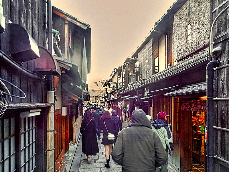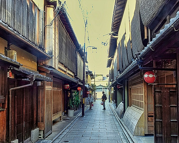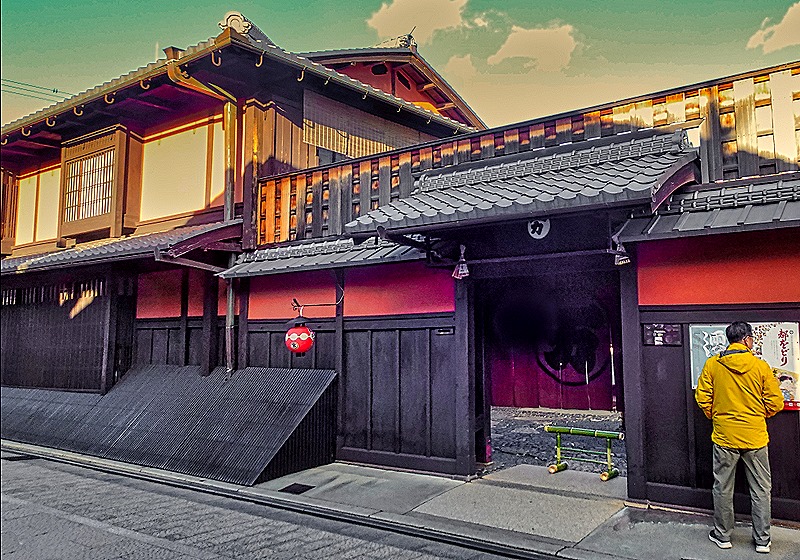 After a while we emerged for a time on what we think was Shijo street, a crowded boulevard lined with commercial establishments, such as shops and restaurants, although even here many of the buildings were of the Machiya design.