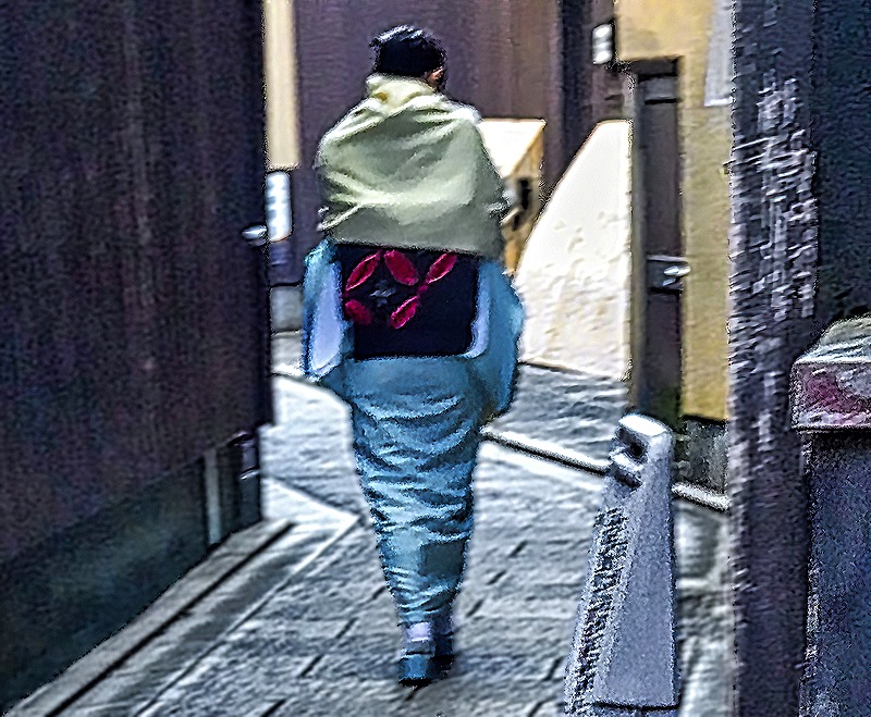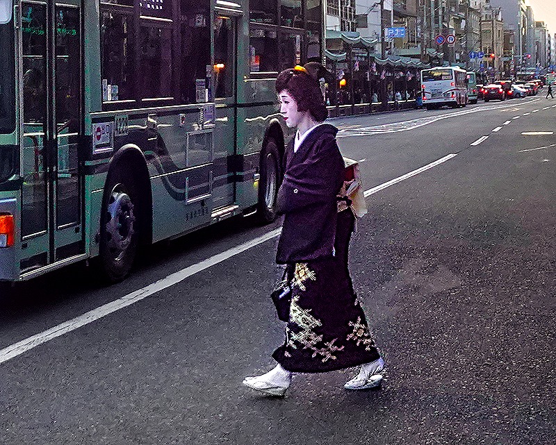 As we saw in Tokyo, there are also shops here that rent geisha style clothing to visitors who want their pictures taken in that guise here, but by law such rented clothing cannot be an accurate representation of geisha attire. Our guide told us that you can tell an actual geisha from a dressed up visitor despite the similar clothing because the geisha are always in a big hurry while the visitors saunter around the area, stopping for photos. Relying on that distinction we think we saw two geisha, both of whom were walking so fast it was difficult to get a photo. One of them was past us so fast we only have a picture of her back, while the other was crossing Shijo street at a distance from us.