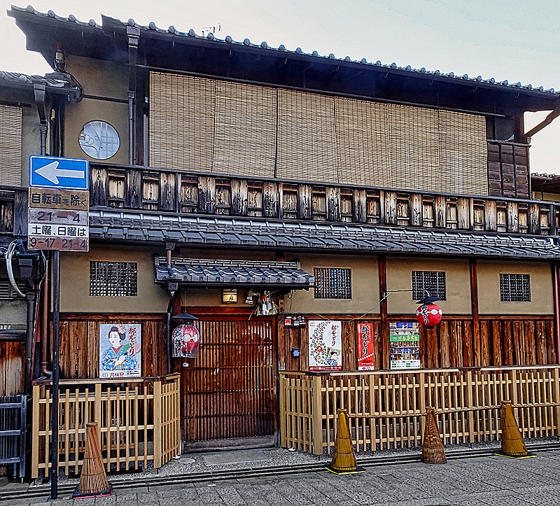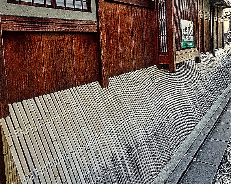 You will notice in the pictures that the sidewalks in this district are quite narrow and several of the houses depicted above have fencing barring use of the sidewalk in front of the house. Instead of fencing, many of these buildings have a sort of curved wooden skirt reaching from the front of the house to the curb. These are called inuyarai. Inu means “dog” and these skirts were probably originally used keep stray dogs from urinating on the front of the house. But they also protect the front wall from mud splashes and keep people from leaning against the house and eavesdropping on what is being said and done inside.