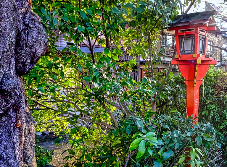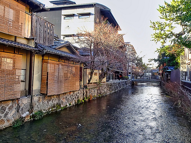 We turned right from Shijo street and walked for a while until we came to the Shirakawa River which runs along the border of the Gion district. We crossed a bridge or two from which we could see the Gion side was lined with teahouses and restaurants of the sort seen in Gion while the opposite side was a riverbank lined mostly with trees (many cherry trees we have read, although they were still in bare winter mode when we were there). We have read that the other side used to be lined with Gion style buildings as well, but they were torn down during World War II as a precaution against fires.