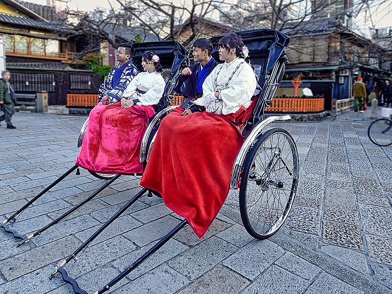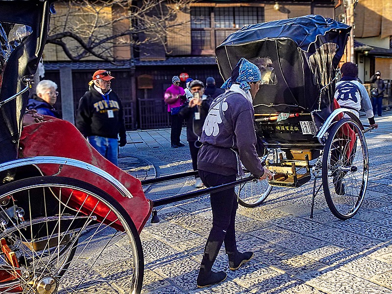 We emerged into a somewhat larger square, in the middle of which is a small red and gray Shinto shrine variably called Tatsumidaimyojin or “Inari of Gion.” Both local residents and geisha worship here. Two men walked into the square pulling metal rickshas, in each of which was a traditionally dressed couple. They stopped and put down the ricksha pulls, then took out cameras and took pictures of the two couples. It must have been some kind of special occasion for them as they posed for pictures in their fine traditional clothes in the ricksha seats.