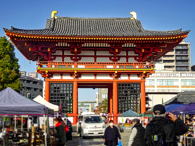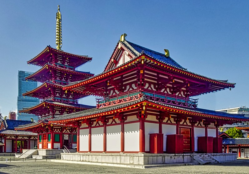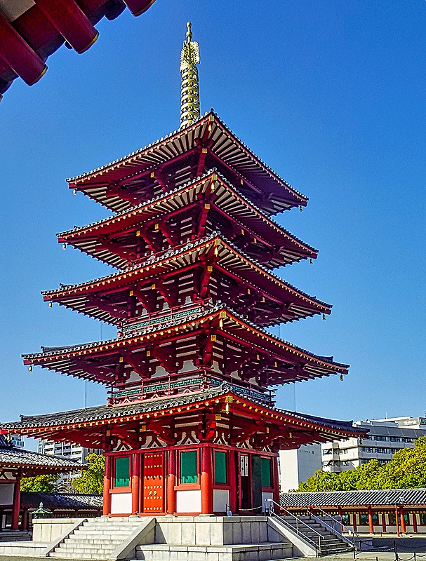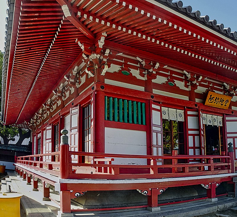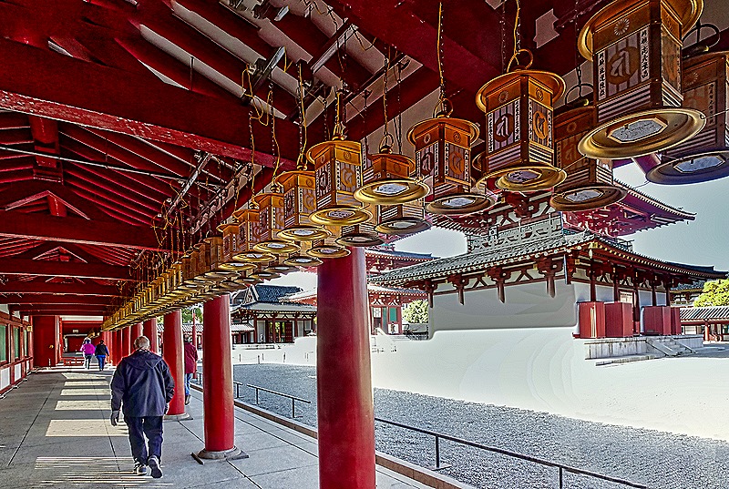 The temple’s core consists of a covered walkway around the main courtyard, with a gate on one side and a lecture hall (Kodo) on the other. In the courtyard are the Kondo (the main hall) and a five story pagoda. The predominant colors of the buildings are red and white. The buildings are aligned in a straight line – Chumon gate, pogoda, kondo, Kodo – an arrangement that came to be known as Shitennoji-style and was widely copied.