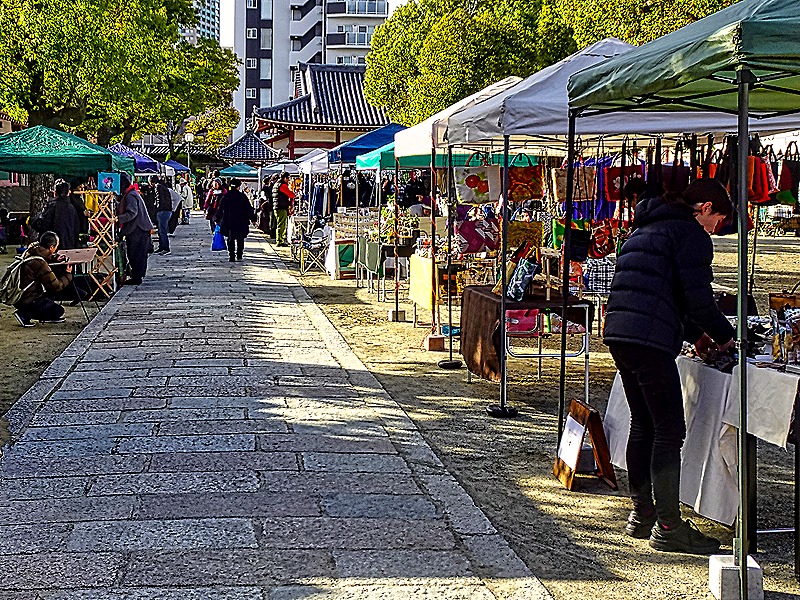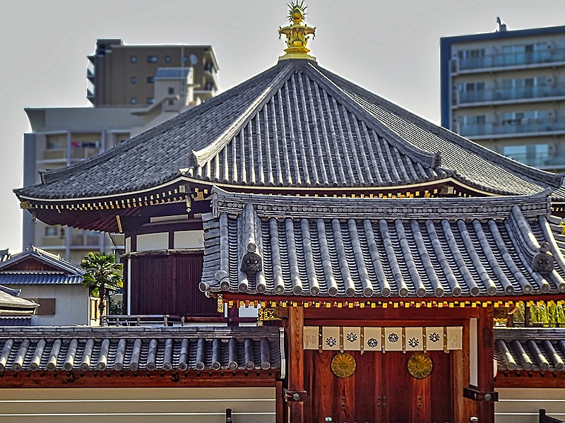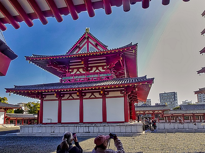 It would be difficult to plan a visit to Japan without including visits to temples and shrines. Our first visit today was to Shitenno-ji Temple, considered by many the oldest Buddhist temple in Japan. It was first built in 593 by Prince Shotoku, one of the first to promote the spread of Buddhism here. Its buildings have been destroyed many times, by both war and natural calamities, most recently by the bombing in World War II. The current reconstruction, based on archeological excavations as well as old records, was completed in 1963 and is considered to be as true as possible to its original appearance.