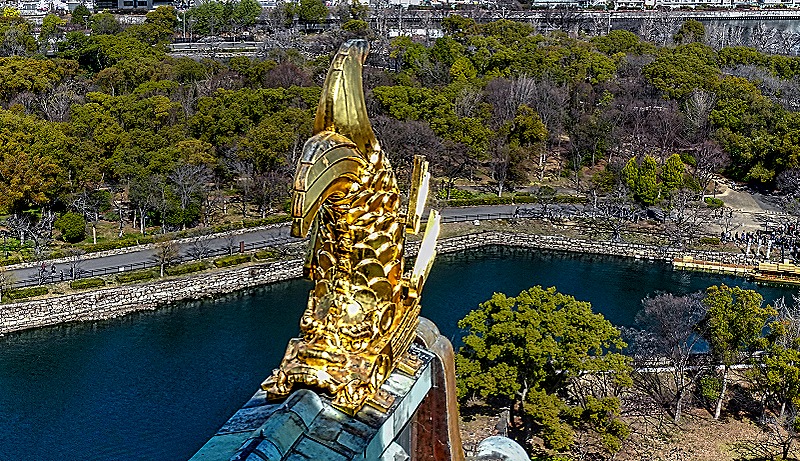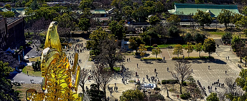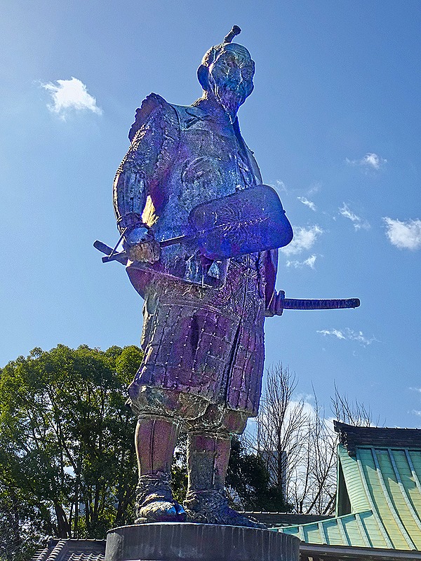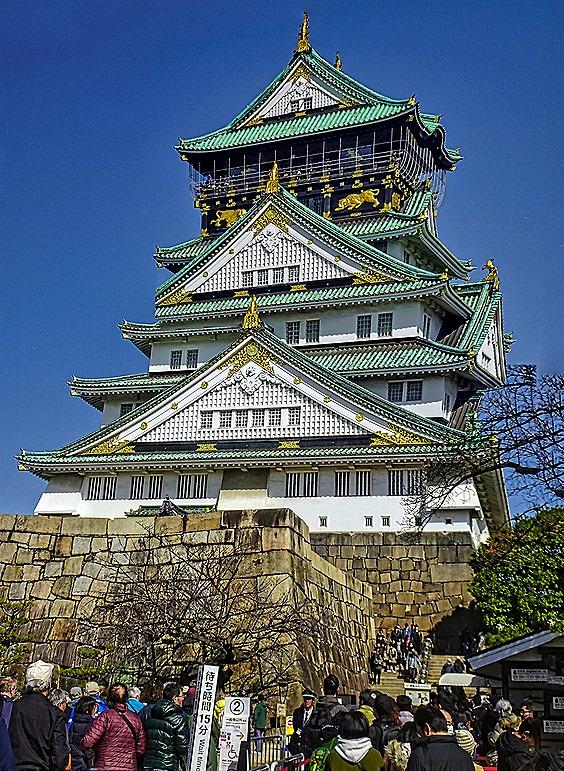 On our way to the castle we passed a small Shinto shrine called Hokoku-jinja. It was built by the Meiji emperor in 1879 to honor the Toyotomi clan. We did not go into the shrine, but we did see the torii gate at its entry and a statue of Toyotomi Hideyoshi erected in 2007, which faces the castle. He does not look warm and cuddly.