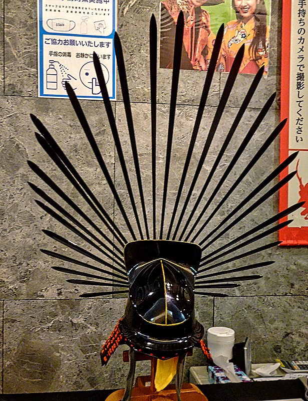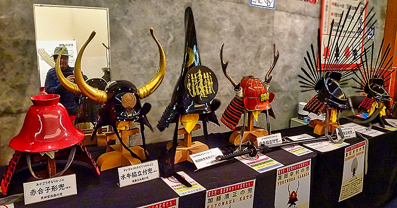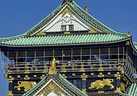There is an elevator inside (as mentioned, this is a modern concrete replica, not the original wooden castle), and the easiest way to see the castle inside would be to take the elevator to the top and walk down the 8 flights of stairs. But the elevator is slow and so many people want (or need) to use it that the wait is substantial and we didn’t really have extra time to waste standing in line. So we walked up the 8 flights of stairs. The castle today is really a museum with exhibits on each floor. Here is an exhibit of ancient Japanese war helmets on one floor, one of which was marked as having belonged to Toyotomi Hideyoshi. For a fee you could don one of these helmets along with some armor to have your picture taken. Also on exhibit was a life size example of the golden dolphin and crouching tigers that adorn the outside of the castle. There were many more interesting exhibits, including large paintings, that were difficult to examine because of the crowds in front of them.