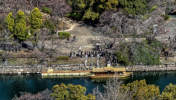 We returned to the ground floor down the stairway (there are separate up and down stairwells, which undoubtedly helps the traffic flow). As we walked back to the bus we had a last view of the castle with its nicely landscaped grounds and also another view of the moat boat, this time sailing down the moat. We ate lunch at a nice hotel, happily a sit down meal rather than a buffet line, where the Japanese food was interesting, tasty and beautifully presented.