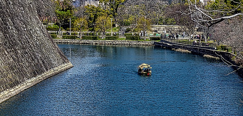 Our next stop was Osaka Castle. On our way there we passed a couple in a park teaching their son how to wield a baseball bat (baseball is, of course, very big in Japan). We parked in a lot a good bit away from the castle and had a long walk, through woods and along moat walls, to get there.