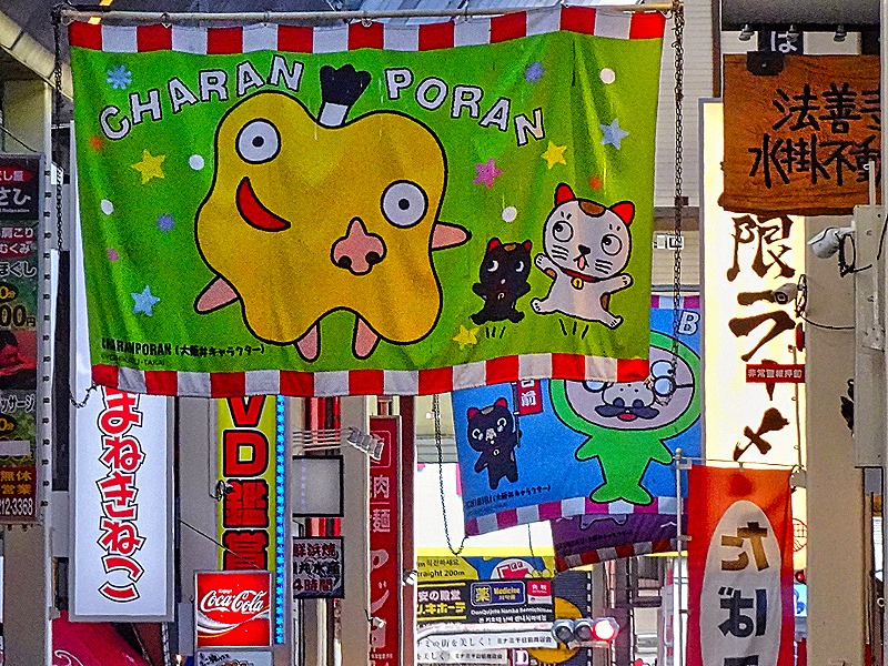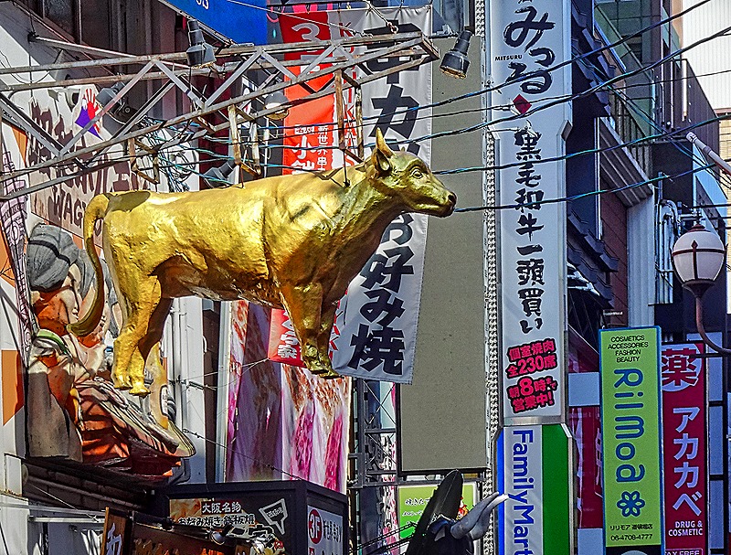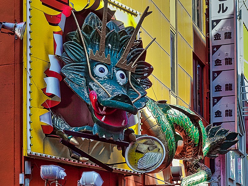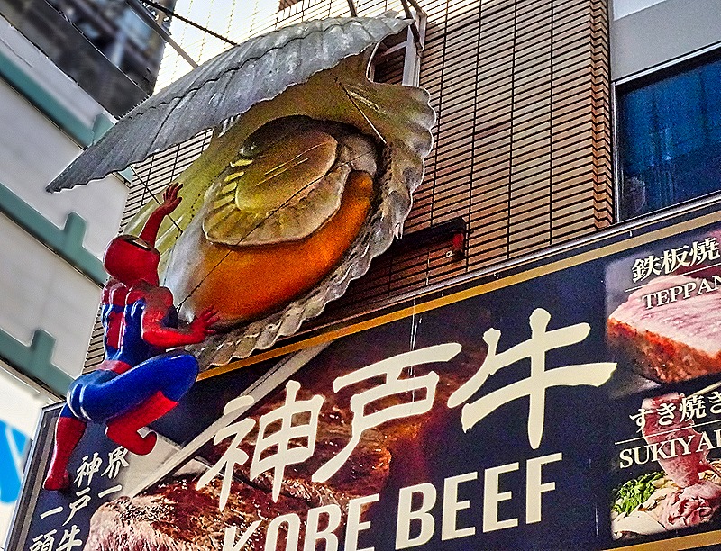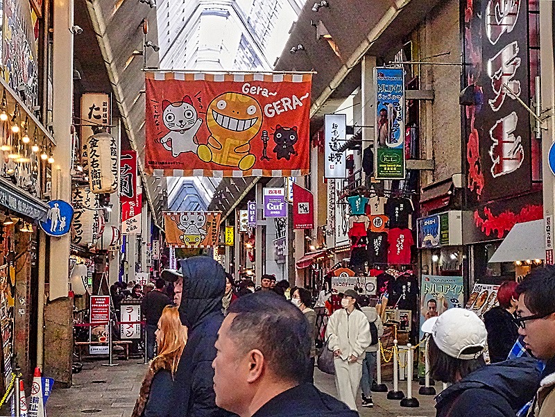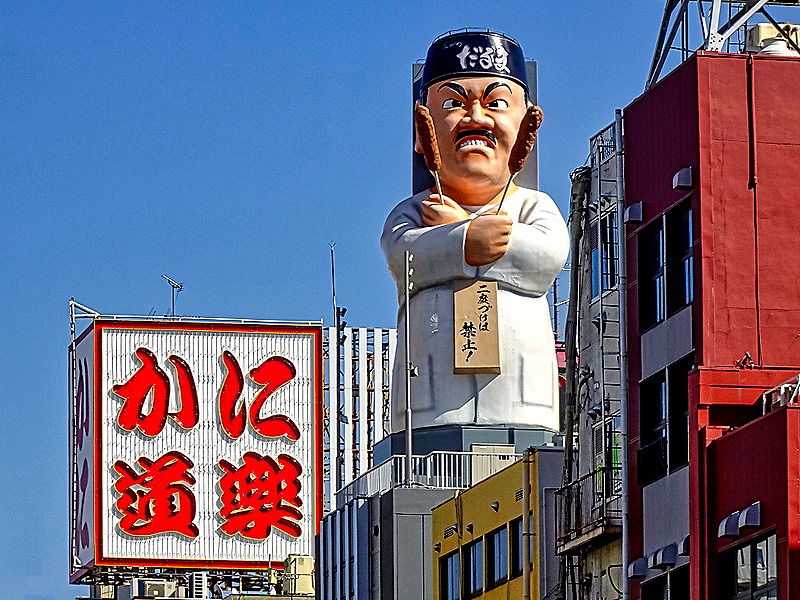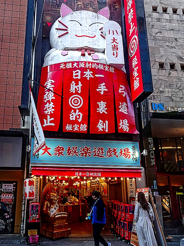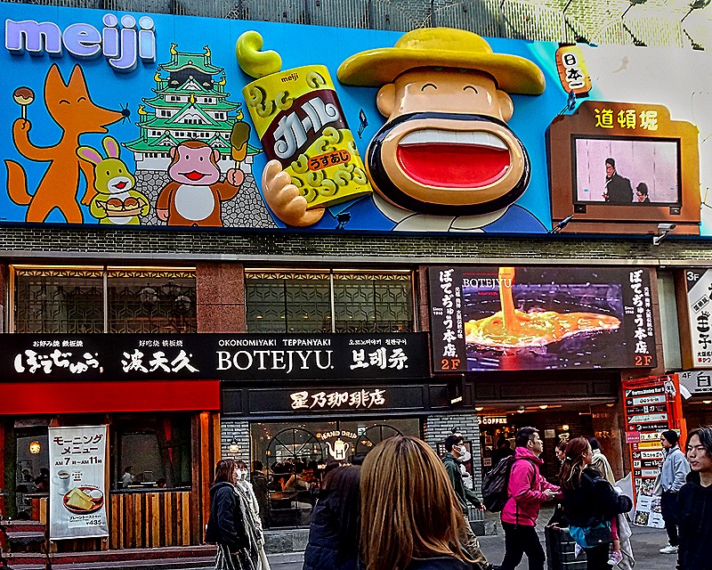 After lunch we were dropped off at the beginning of a district called Dotonbori (or Doutonbori) and told to meet back there in an hour or so. This neighborhood began in 1612 with the building of a canal on what was then the southern edge of Osaka. The canal was completed in 1615, after a delay caused by the Siege of Osaka. It was named after one of its designers, Nariyasu Doton, who had died fighting for the Toyotomis during the siege. The Tokugawas designated this as Osaka’s entertainment district and by 1662 it had 11 theaters and a mechanical puppet show, along with restaurants and cafes built to serve the entertainment crowds. However, over the centuries the district declined and during World War II all but one of the remaining theaters were destroyed by bombing. In the 1960’s the canal was renovated and in the early 2000’s the streets lining the canal were redeveloped.