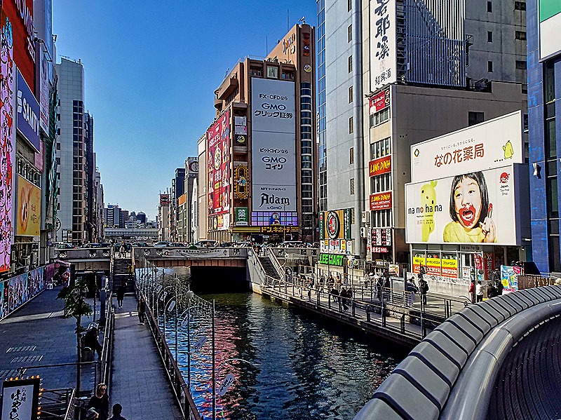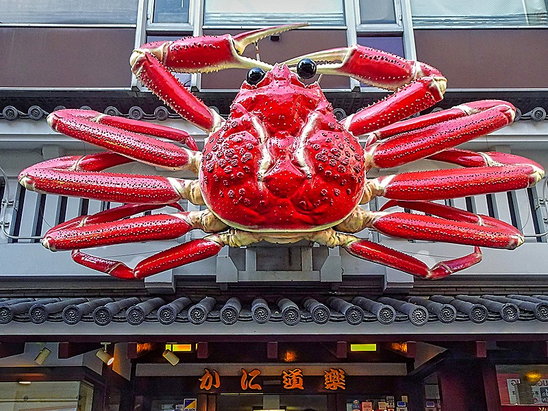 As you can see, the canal is lined with rows of commercial buildings of all types. Most notable are the colorful signs, many outsized, eye catching and even mechanical. For example the giant crab above the Kani Doraku restaurant moves all of its arms.
