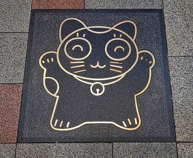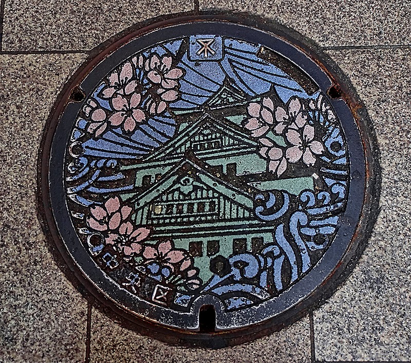 Walking back down along the canal we saw more unusual commercial signs, some very large and surely quite expensive. We also walked past street decorations, one of which was a manhole cover with the Osaka castle and cherry blossoms on it.