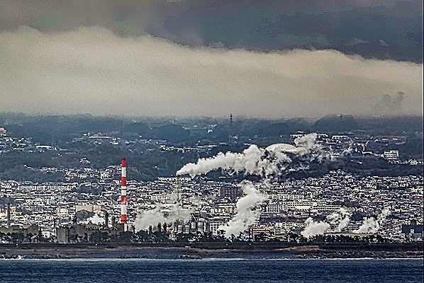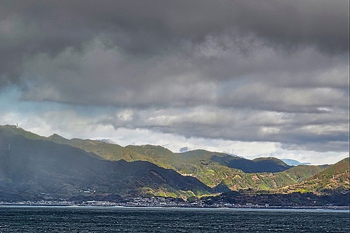 After the Captain’s announcement Rick went outside to try at least to get a picture of Omaezaki from the ship since we weren’t stopping there. He took a number of pictures along the shore, but on later inspection none of them looked like Omaezaki, whose shoreline is dominated by a white lighthouse with beaches and few other buildings near the water (according to pictures we have seen). We are pretty sure we were somewhere in Suruga Bay, but the area was too heavily overcast to identify. I think I have identified in one picture (the last one below) the Fujikawa water pipe bridge across the Fuji river near the shore of Suruga Bay, which has a series of metal arches like this. If so, Mt Fuji would be visible right behind it but hidden by the heavy cloud cover (as it apparently often is), but that would put us far from Omaezaki. So, who knows? Other shore pictures include industrial smokestacks and impressive mountains.