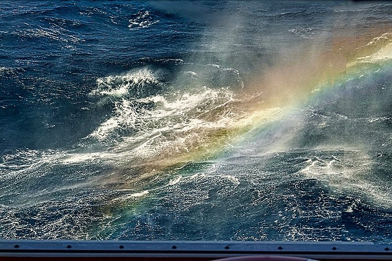 Well, as our friend Pete commented, having an unscheduled sea day added in the middle of a long series of port days is like having a snow day when you are working or in school, an unexpected opportunity to rest up and recharge your batteries. So that’s how we looked at it when, in late morning, it was announced that the sea was still too turbulent for us to stop here. Sometimes it seems to passengers that the sea isn’t really bad enough to skip a port, but not this time. The roiling of the water was enough that we could sometimes see rainbows in the mist that was thrown up by the waves, even from our deck 5 veranda.